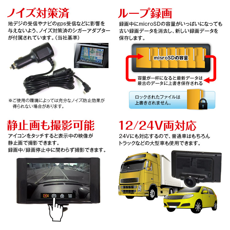 本体×1、取付スタンド×1、シガーアダプター×1、バックカメラ×1、バックカメラ接続ケーブル×1、取付ネジセット×1、ステッカー×1、日本語取扱説明書