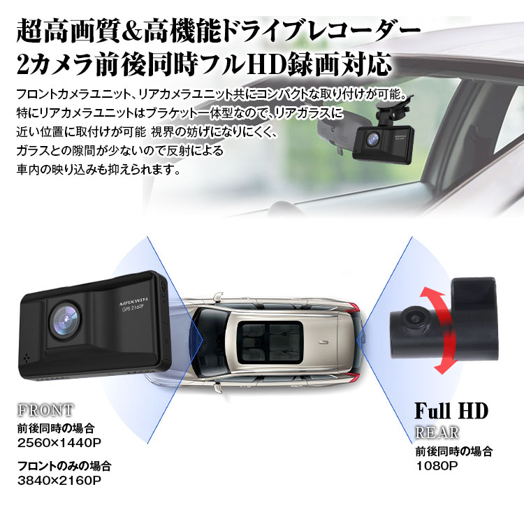 - 録画解像度(前後同時録画時):フロントカメラ 2560×1440P、リアカメラ FHD 1080P