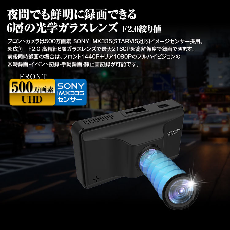 SONY STARVISセンサー搭載しておりフロントカメラは超広角 F2.0 高精細6層ガラスレンズで最大2160P超高解像度で録画できます。前後同時録画の場合は、フロント1440P+リア1080Pのフルハイビジョンの常時録画・イベント記録・手動録画・静止画記録が可能です。