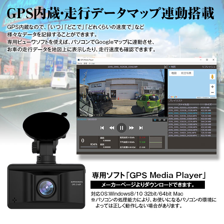 GPS内蔵なので、「いつ」「どこで」「どれくらいの速度で」など様々なデータを記録することができます。専用ビューワソフトを使えば、パソコンでGoogleマップに連動させ、お車の走行データを地図上に表示したり、走行速度も確認できます。