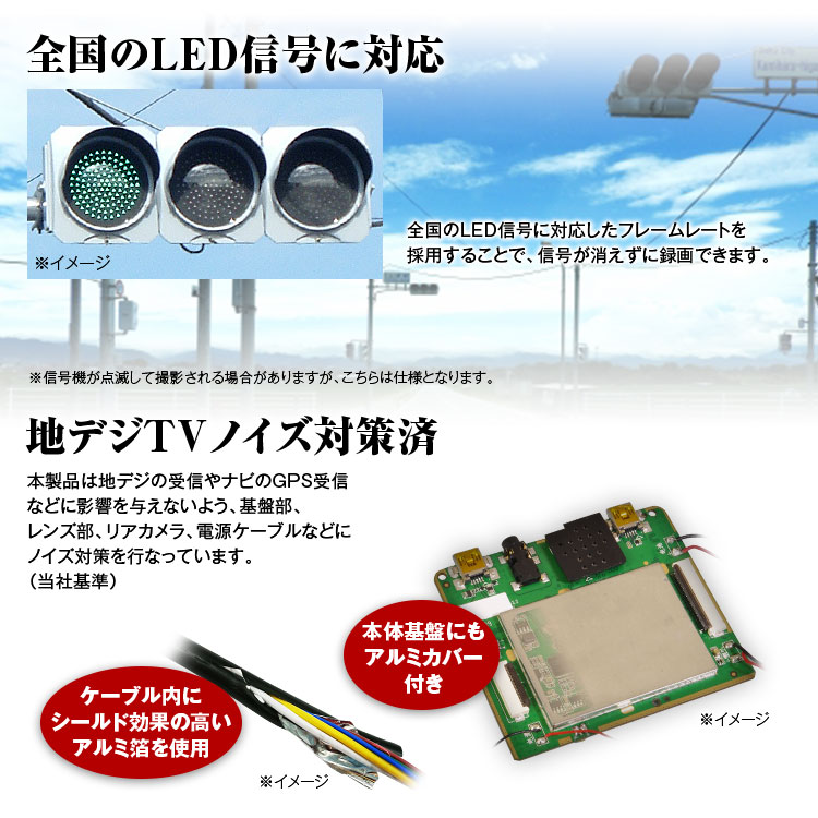 本製品は地デジの受信やナビのGPS受信などに影響を与えないよう、基盤部、レンズ部、リアカメラ、電源ケーブルなどにノイズ対策を行っています。