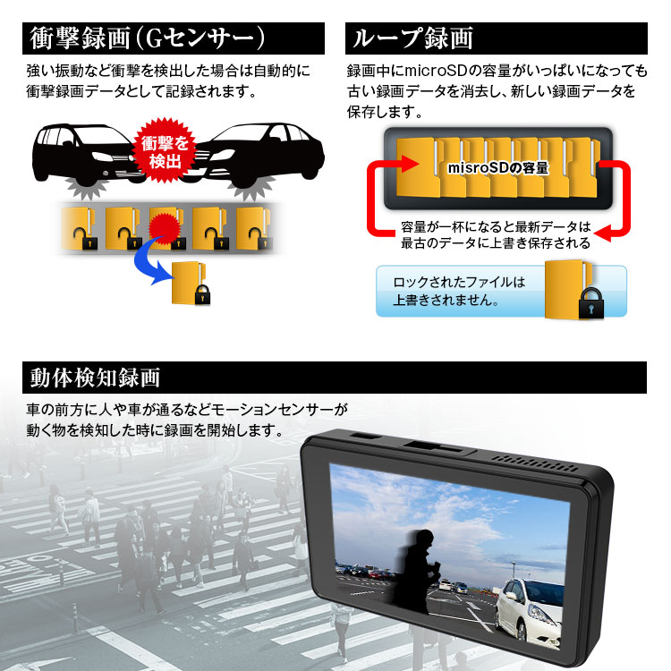 強い振動が感知されるとその時録画されていたファイルがロックされます。大切なデータが上書きされてしまうことがなく、もしもの時も安心です。