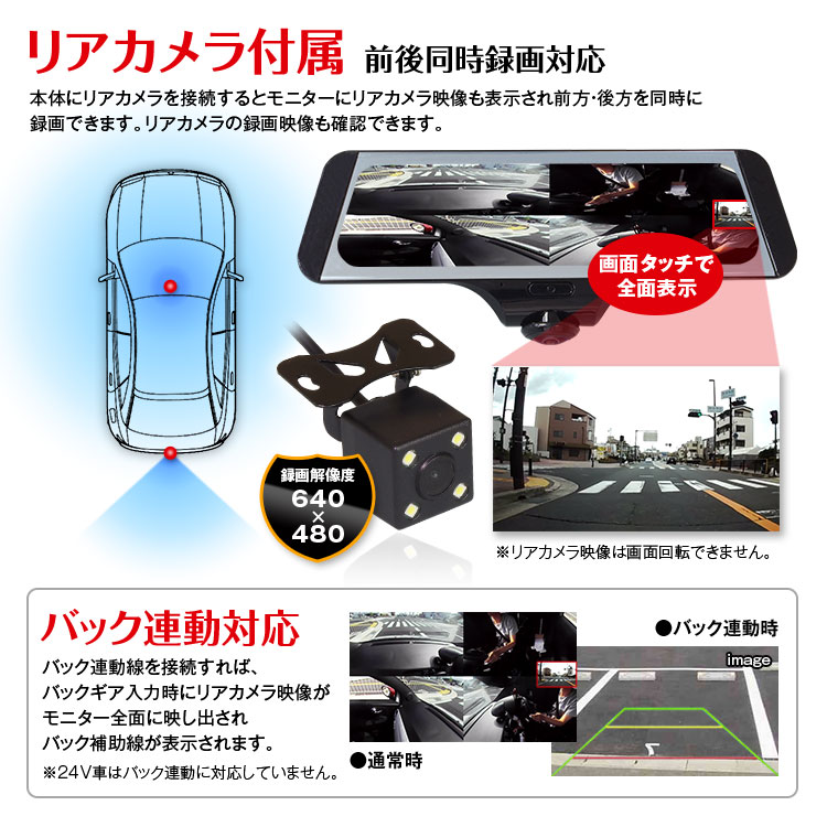 リアカメラ付属で2カメラ同時録画に対応。バック連動線を接続すれば、バックギア入力時にバックカメラ映像がモニター全面に映し出されバック補助線が表示されます。