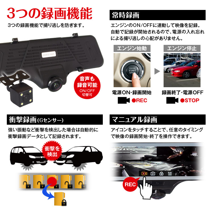 強い振動が感知されるとその時録画されていたファイルがロックされます。大切なデータが上書きされてしまうことがなく、もしもの時も安心です。