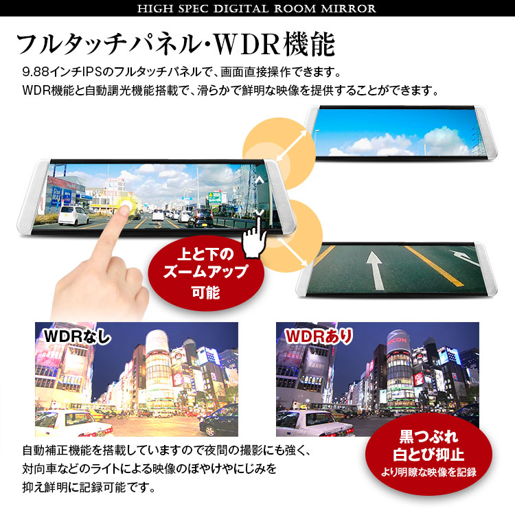 9.88インチIPSのフルタッチパネルで、画面直接操作できます。WDR機能で、滑らかで鮮明な映像を提供することができます。