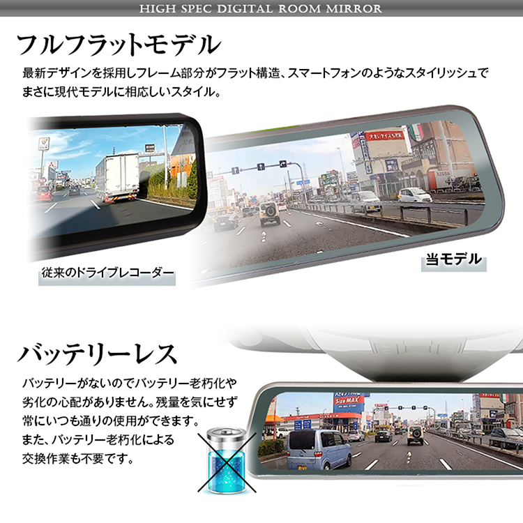 視界が遮られがちな従来のミラー型ドライブレコーダーと違い、液晶全体に映像が映し出され、従来のルームミラー同様の映像を見ることが可能。