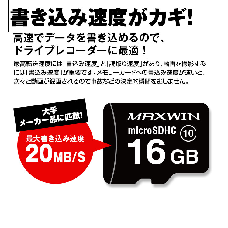 ドライブレコーダー専用のモデルです。通常のSDカードより書き込みスピードを強化しております。