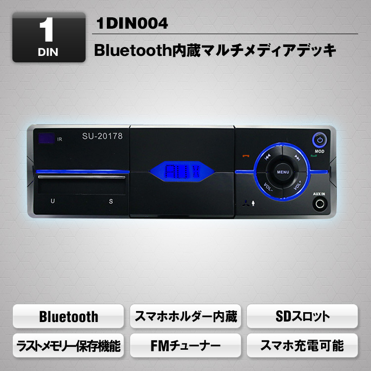Bluetooth/SD/USB/AUX機能搭載1DINカーオーディオです。スマホホルダーも付いており、スマートフォンとの操作性も考慮したデザインです。