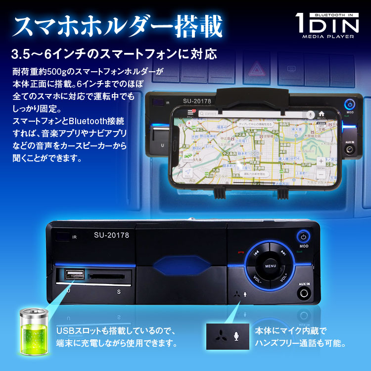 耐荷重約500gのスマホホルダー付きBluetooth対応1DINカーオーディオ