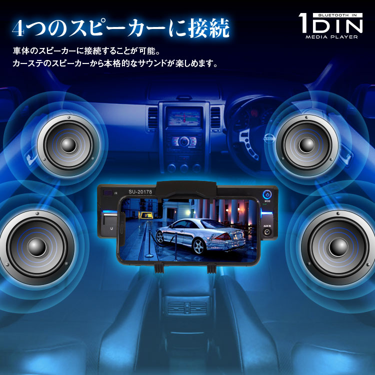 Bluetooth/SD/USB/AUX機能搭載1DINカーオーディオです。スマホホルダーも付いており、スマートフォンとの操作性も考慮したデザインです。