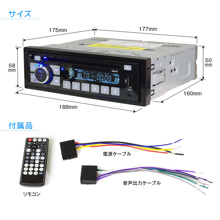 本体×1、リモコン×1、電源ケーブル×1、音声出力ケーブル×1、電源ケーブル×1、
