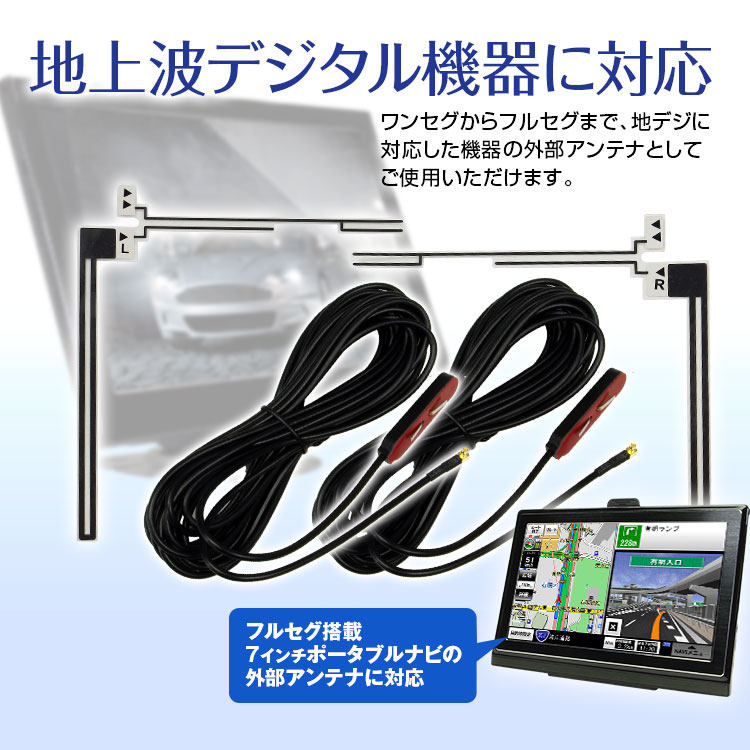 ワンセグからフルセグまで、地デジに対応した機器の外部アンテナとしてご使用いただけます。