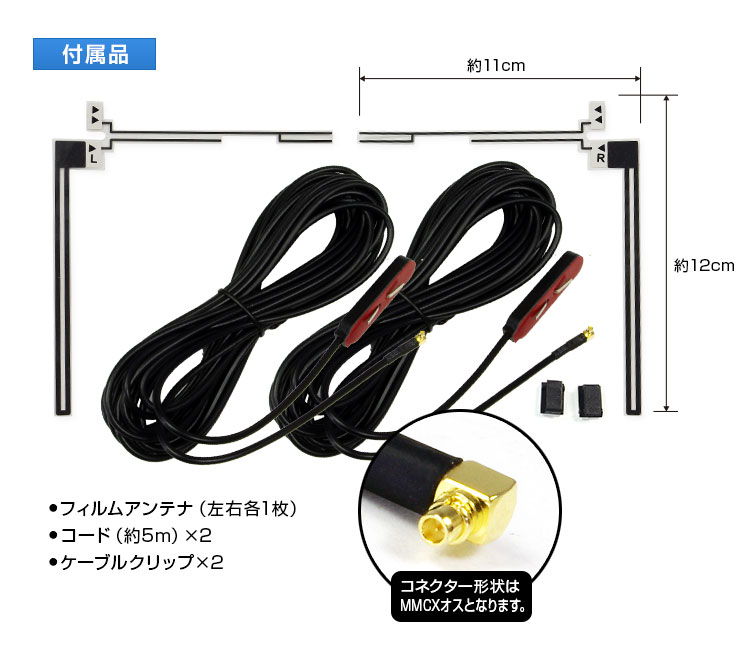 フィルムアンテナ左右各1枚、コード(約5m)×2、ケーブルクリップ×2