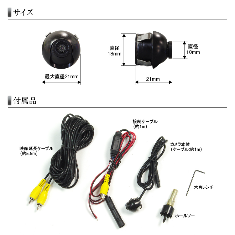 本体/ケーブル長さ約1m×1、接続ケーブル/約1m×1、映像延長ケーブル/5.5m×1、ホールソー×1、六角レンチ×1