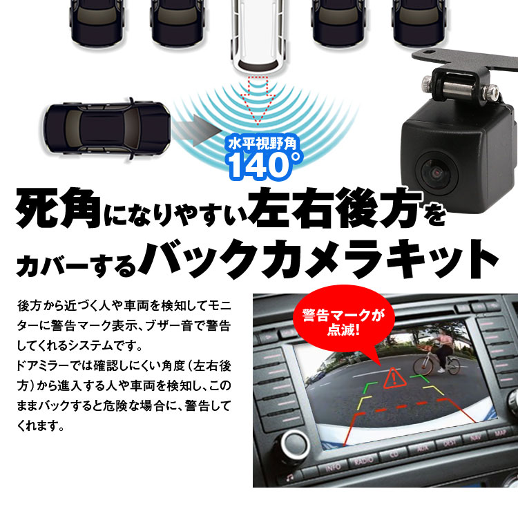 駐車中は後方の人や車両が見えにくい・・・という時に、確認しづらいエリアの安全確認をサポートする、バックカメラキットです。CMOSセンサー採用の高画質な広角バックカメラに画像認識機能を加えて、車両後方の安全性向上に効果を発揮します。モニター上で警告マーク表示の点滅とブザー音でドライバーに危険を知らせます。