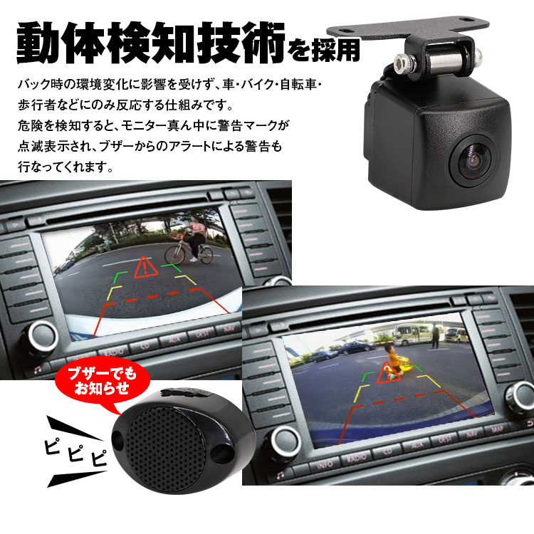 バック時の環境変化に影響を受けず、車・バイク・自転車・歩行者などにのみ反応する仕組みです。危険を検知すると、モニター真ん中に警告マークが点滅表示され、ブザーからのアラートによる警告も行なってくれます。