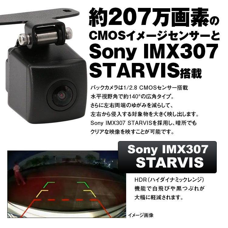 バックカメラは1/2.8 CMOSセンサーで水平視野角で約140°の広角タイプ。さらに左右両端のゆがみを減らして、左右から侵入する対象物を大きく映し出します。Sony IMX307 STARVISを採用し、暗所でもクリアな映像を映すことが可能です。HDR(ハイダイナミックレンジ)機能で白飛びや黒つぶれが大幅に軽減されます。