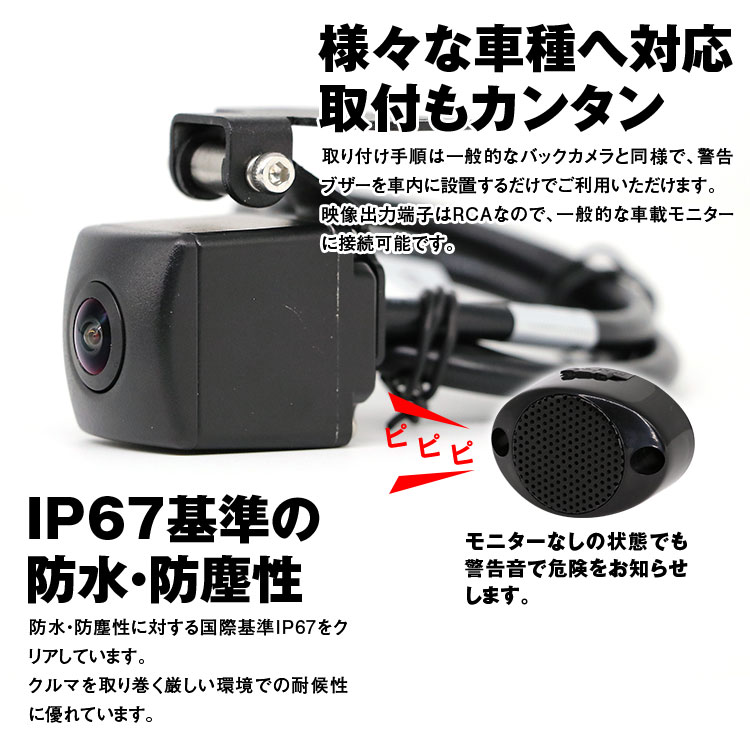 取り付け手順は一般的なバックカメラと同様で、警告ブザーを車内に設置するだけでご利用いただけます。映像出力端子はRCAなので、一般的な車載モニターに接続可能です。モニターなしの状態でも警告音で危険をお知らせします。
