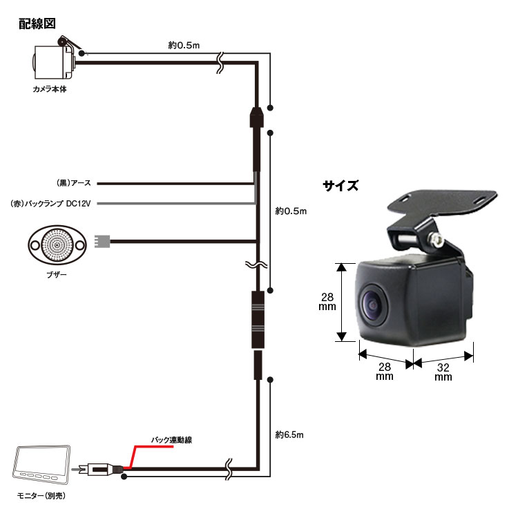 カメラ本体(ケーブル長さ:0.5m)×1、電源ケーブル×1、RCA中継ケーブル(6.5m)、ブザー×1、ブザー用両面テープ×1、カメラ用両面テープ×1、エレクトロタップ×3、取付ネジ×3