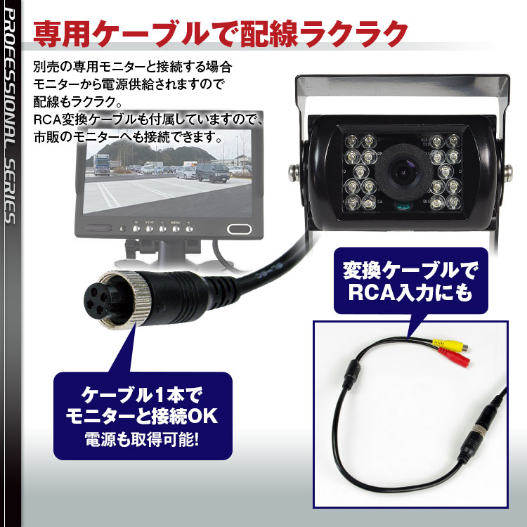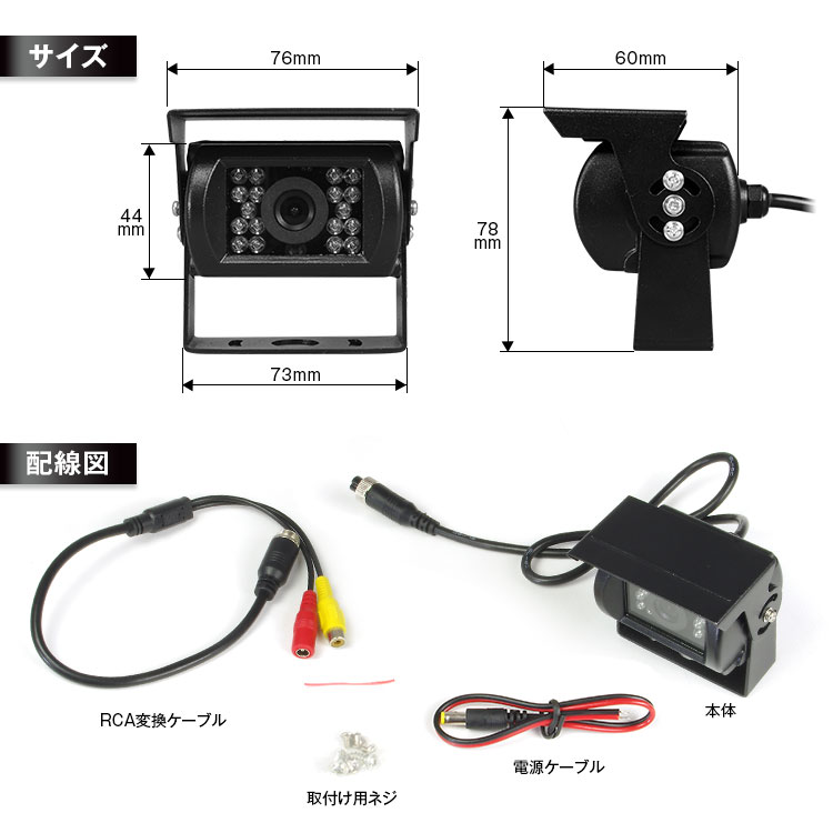赤外線暗視機能により夜間での使用も可能です。24V対応でトラックの後方確認に最適です。
