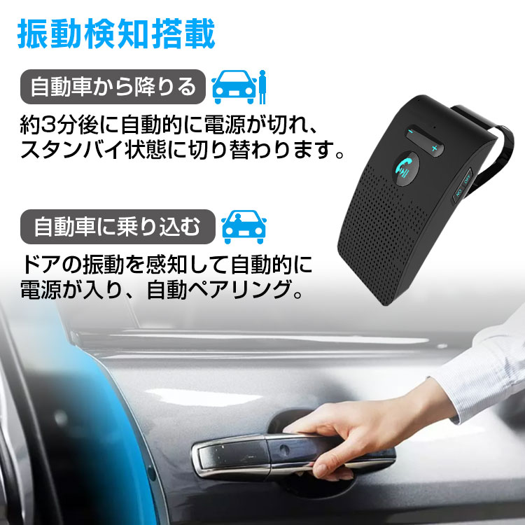 自動車から降りた場合、本体とスマートフォンのBluetooth接続が切れてから約3分後に自動的に電源が切れてスタンバイ状態に切り替わる省エネモードです。自動車に乗り込むと、ドアの振動を感知して自動的に電源が入り、スマートフォンのBluetoothを開いて自動ペアリングを行います。