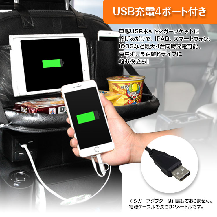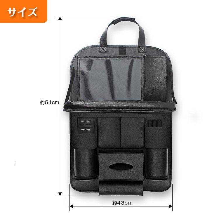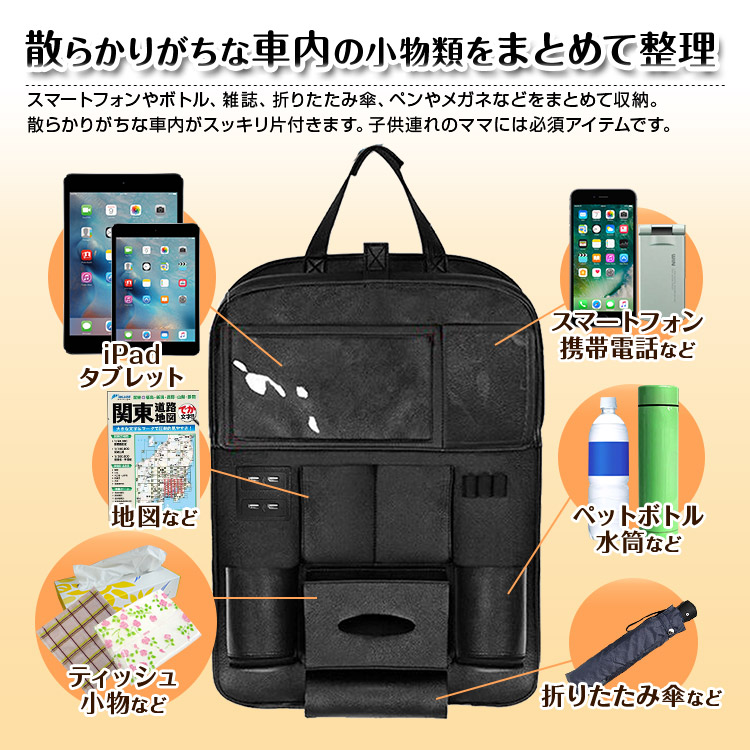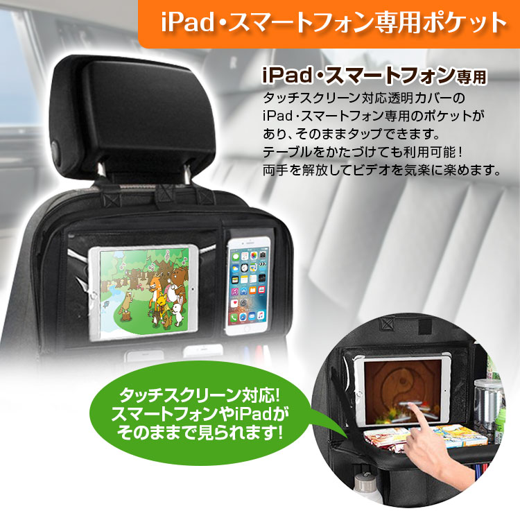 iPad、スマートフォン専用ポケット・USB充電4ポート付きで便利。タッチスクリーン対応の透明ポケットで、スマートフォンやiPadがそのままで見られます!ティッシュケースやドリンクなどたくさんの小物が収納出来る9ポケット付き!