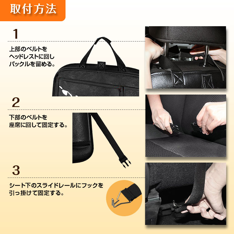 取付には特別な工具も一切必要なし!前座席のヘッドレストの足の部分とシートに取り付けるタイプで、誰でもカンタンに取付可能!