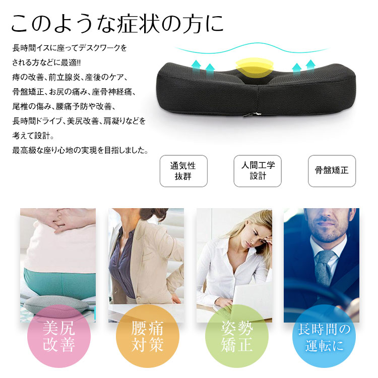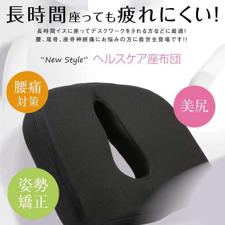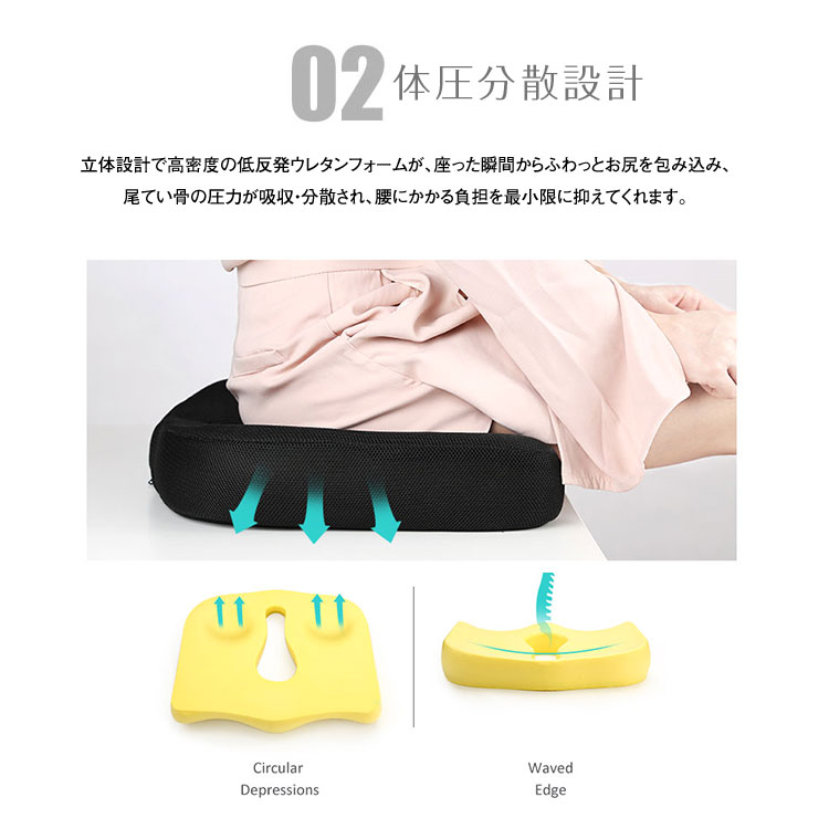 立体設計で高密度の低反発ウレタンフォームが、座った瞬間からふわっとお尻を包み込み、尾てい骨の圧力が吸収・分散され、腰にかかる負担を最小限に抑えてくれます。長く座っていても疲れにくく、腰痛で悩んでいる方、長時間のデスクワークで姿勢が気になる方、車椅子の補助にも使えます。