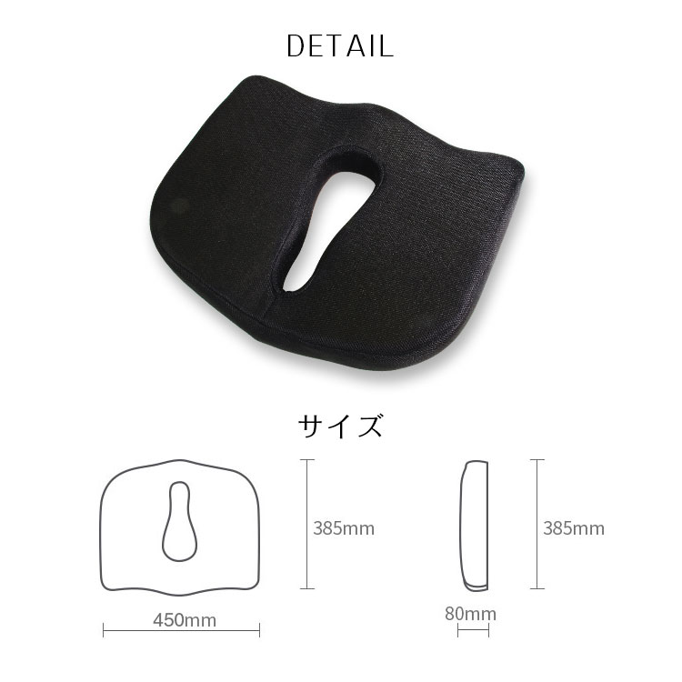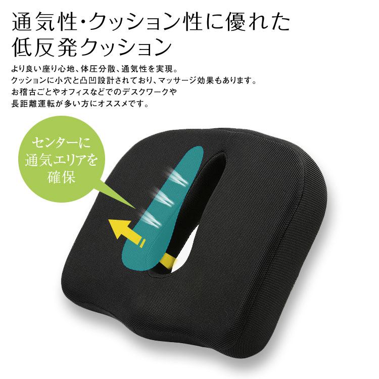 より良い座り心地、体圧分散、通気性を実現。クッションに小穴と凸凹設計されており、マッサージ効果もあります。お稽古ごとやオフィスなどでのデスクワークや長距離運転が多い方にオススメです。