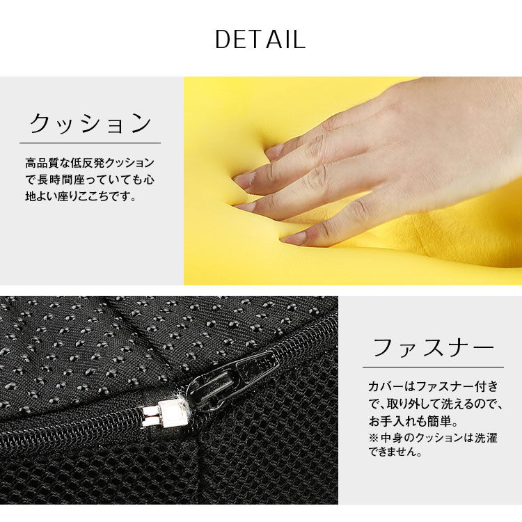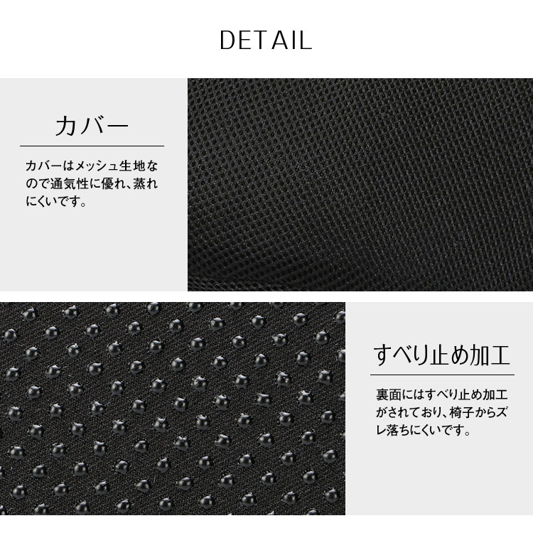 カバーはメッシュ生地なので通気性に優れ、蒸れにくいです。裏面にはすべり止め加工がされており、椅子からズレ落ちにくいです。カバーはファスナー付きで、取り外して洗えるので、お手入れも簡単。