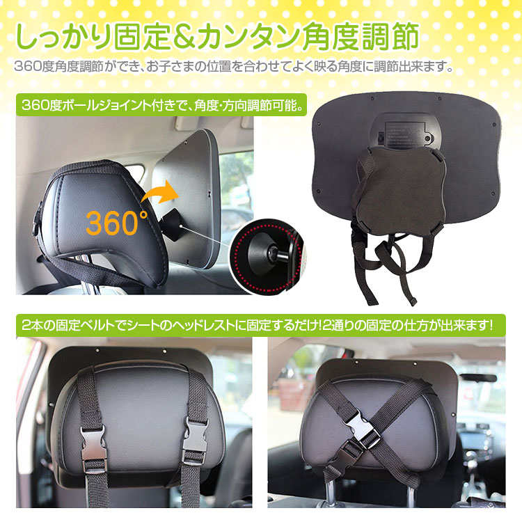 360度角度調節ができ、ミラーをただお好みの方角に回すだけです。後部座席の後ろ向きチャイルドシートに座るお子さまやペットを走行中でもバックミラー越しに確認できます。