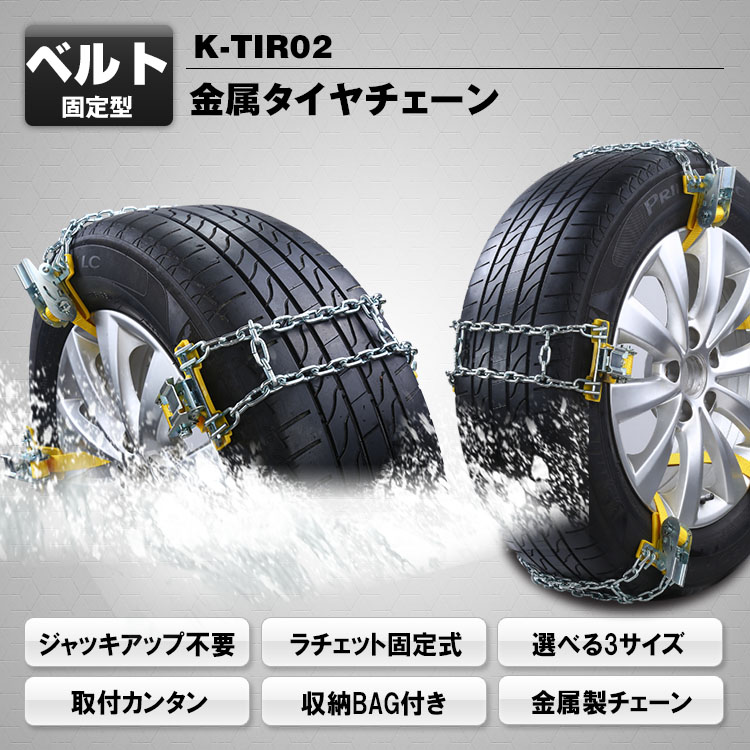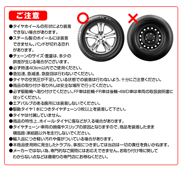 取扱いやすい分割式、取り付けが簡単な新型金属タイヤチェーンです。車内で場所を取らないサイズなので、突然の悪天候や路面の凍結などの緊急時にも手軽に持ち運べて、サッと取り出してすぐさま装着が可能です。