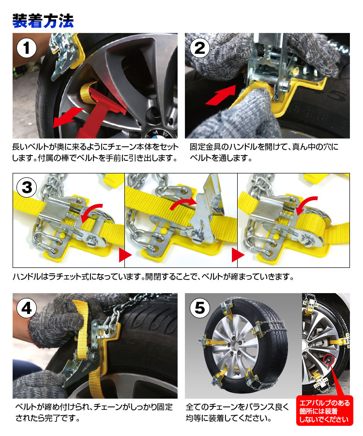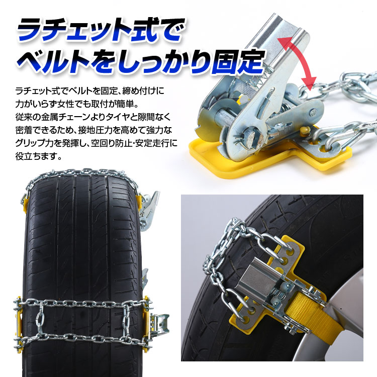 ラチェット式でベルトを固定、締め付けに力がいらず女性でも取付が簡単。従来の金属チェーンよりタイヤと隙間なく密着できるため、接地圧力を高めて強力なグリップ力を発揮し、空回り防止・安定走行に役立ちます。