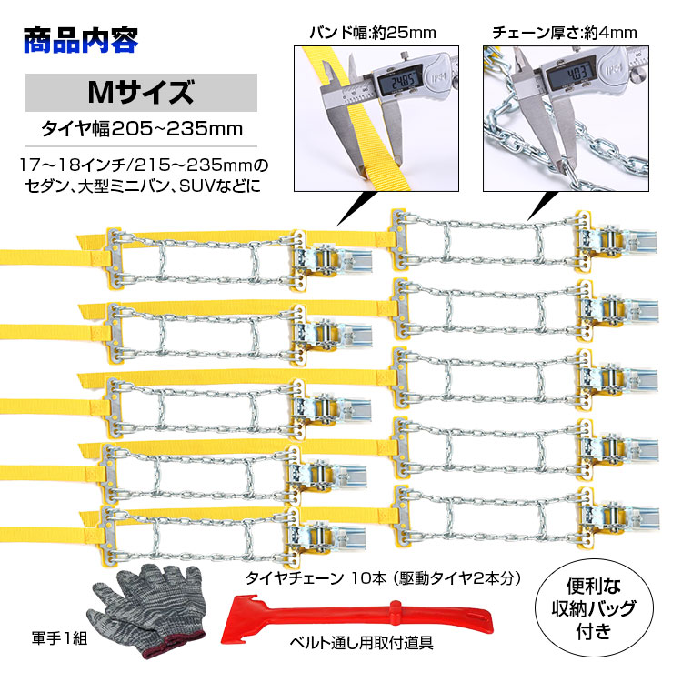 タイヤチェーンセット、軍手1組、ベルト通し用取付道具、収納バッグ 、取扱説明書(英語版)