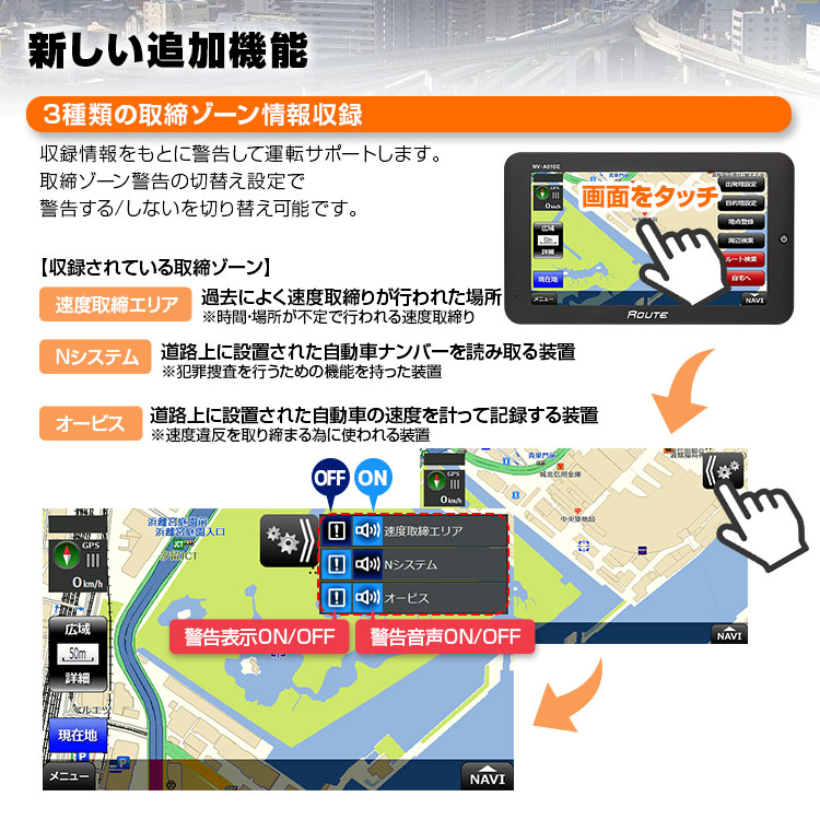 GPS位置データから、オービス(速度取締機)設置場所・ネズミ捕りエリアをアイコンや警告音で案内します。