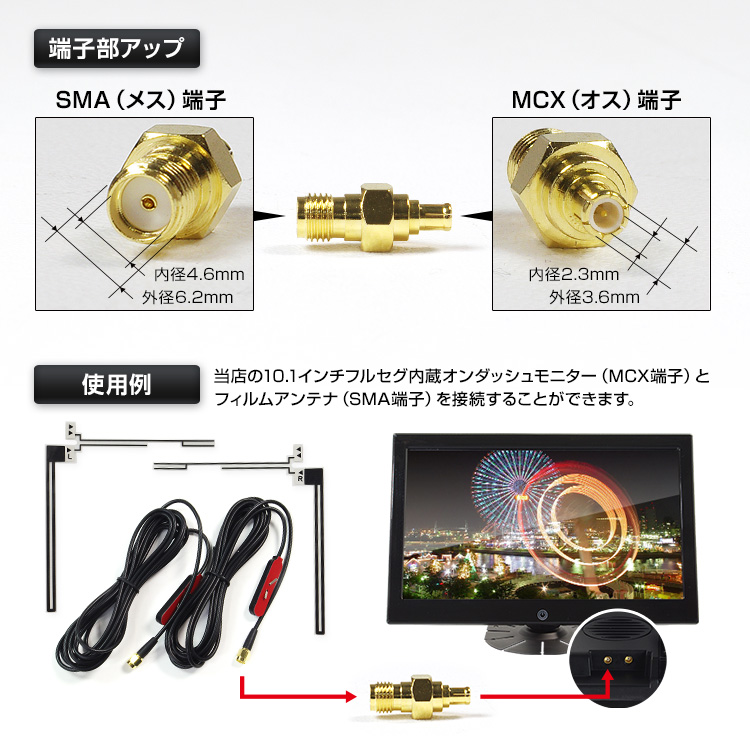 SMA⇔MCXを接続するコネクタです。SMA端子のアンテナとMCX端子搭載のモニターを接続する際などに便利です。