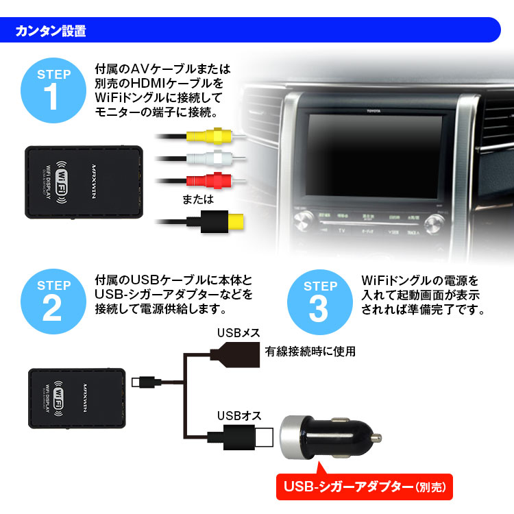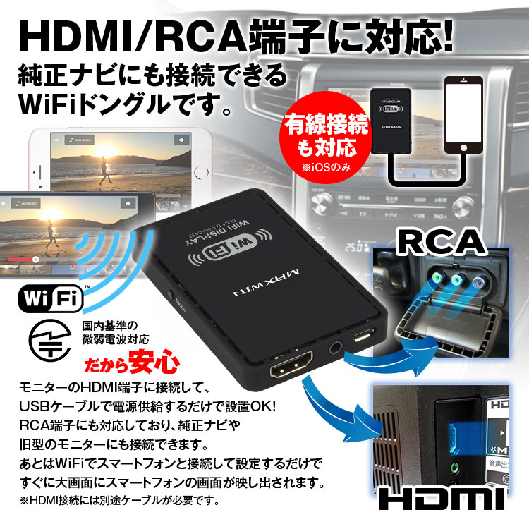 お持ちのスマートフォンの画面がワイヤレスで純正ナビやモニターで楽しめるWiFiドングルです。iOSでもAndroidでも対応します。(Android4.2以上)iOSはAirPlay機能で、Androidは「Miracast」や「Screen mirroring」などの機能を使っていますので接続もカンタンです。