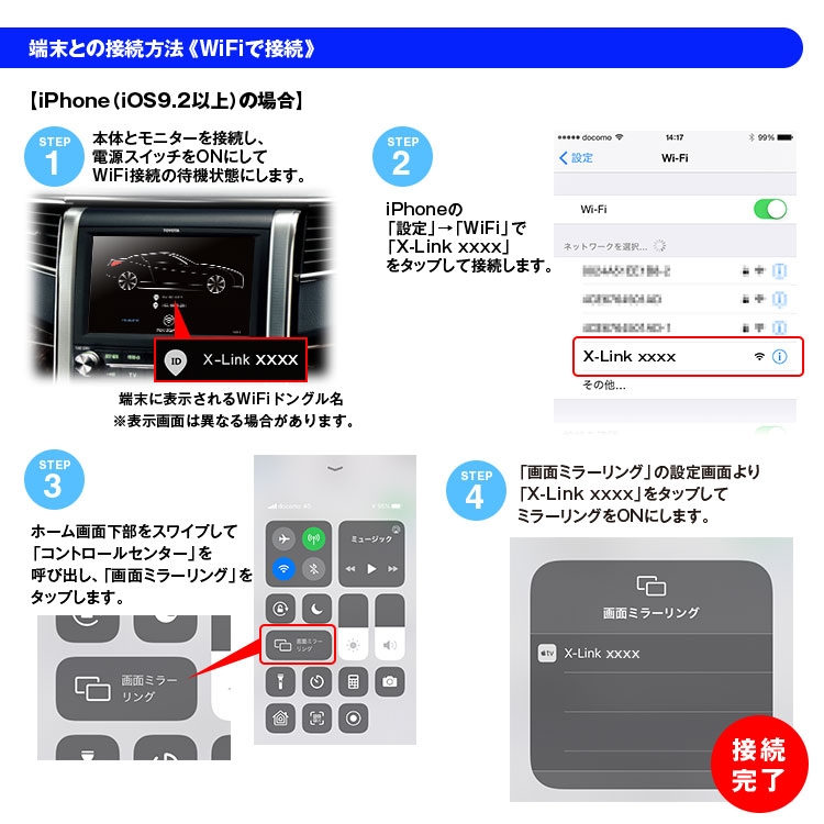 WiFi接続タイプなのでワイヤレスでiPhone・Androidに接続可能です。iPhoneはAir Play、AndroidはMirracastなどに対応していますのミラーリングが可能です。