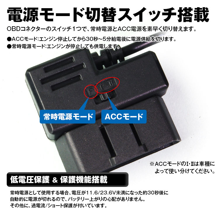 OBDコネクターのスイッチ1つで、常時電源とACC電源を素早く切り替えます。