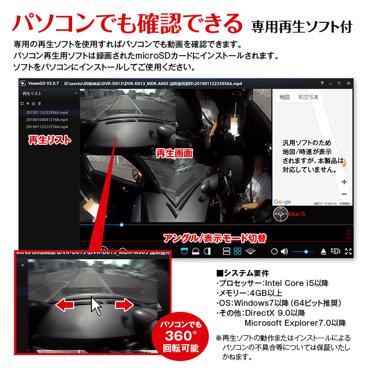 録画済みのmicroSDに専用の再生ソフトがインストールされ、パソコンでも様々なアングルの再生ができます。