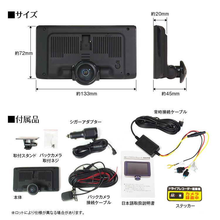 本体×1、取付スタンド×1、シガーアダプター×1、バックカメラ×1、バックカメラ接続ケーブル×1、取付ネジセット×1、ステッカー×1、日本語取扱説明書