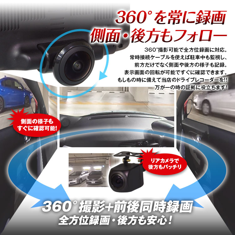 360°カメラとリアカメラの同時録画で死角ナシ!