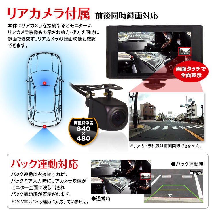 リアカメラ付属で2カメラ同時録画に対応。バック連動線を接続すれば、バックギア入力時にバックカメラ映像がモニター全面に映し出されバック補助線が表示されます。