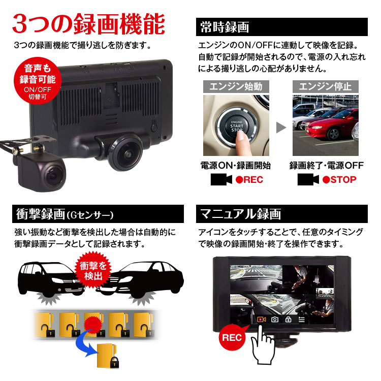 強い振動が感知されるとその時録画されていたファイルがロックされます。大切なデータが上書きされてしまうことがなく、もしもの時も安心です。