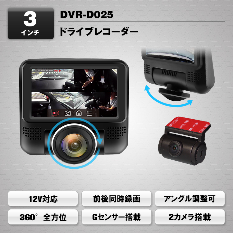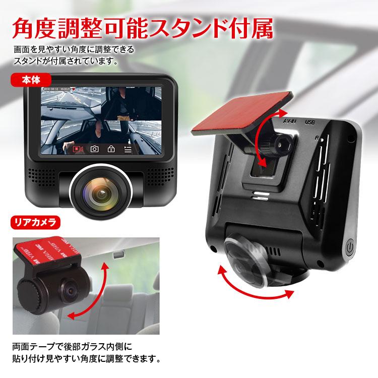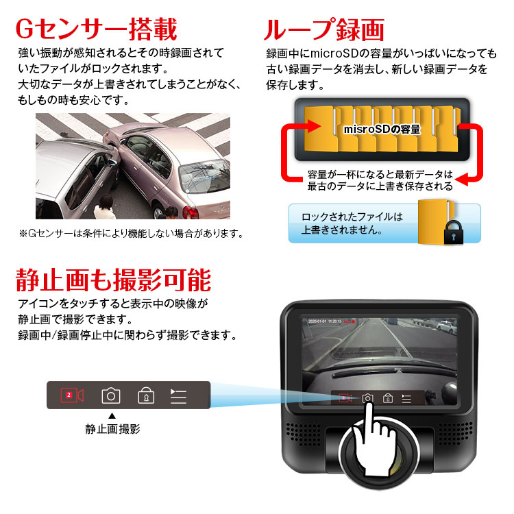 フロント・リアの前後同時録画機能を搭載。フロントカメラ(1440×1440pixel)リアカメラ(1920×1080pixel)の録画が可能です。また、エンジンに連動して自動で録画を開始・終了します。容量が最大になると自動で古いデータを消去します。