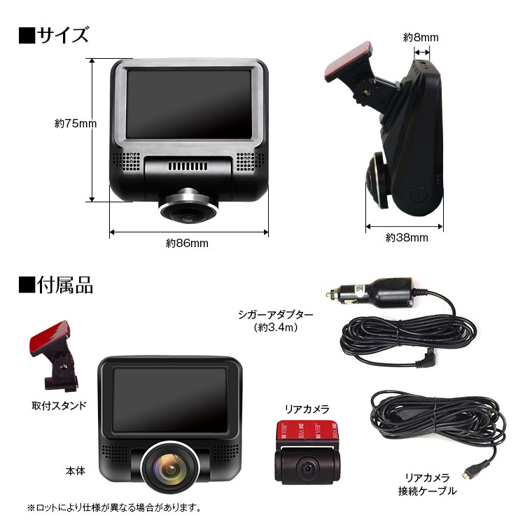 本体×1、シガー電源ケーブル(約3.4m)×1、リアカメラ×1、リアカメラ接続ケーブル×1、日本語説明書×1