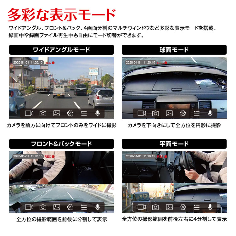 フロントの1台のカメラで同時に4画面。前後左右の録画が可能です。フロントカメラは水平360°を2K画質、リアカメラはFullHD画質で後方の映像を鮮明に撮影します。