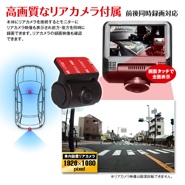 後方の追突やあおり運転などもしっかり録画でき、本体ワイプ表示部分をタッチすると、リアカメラ映像が全画面に切り替わります。