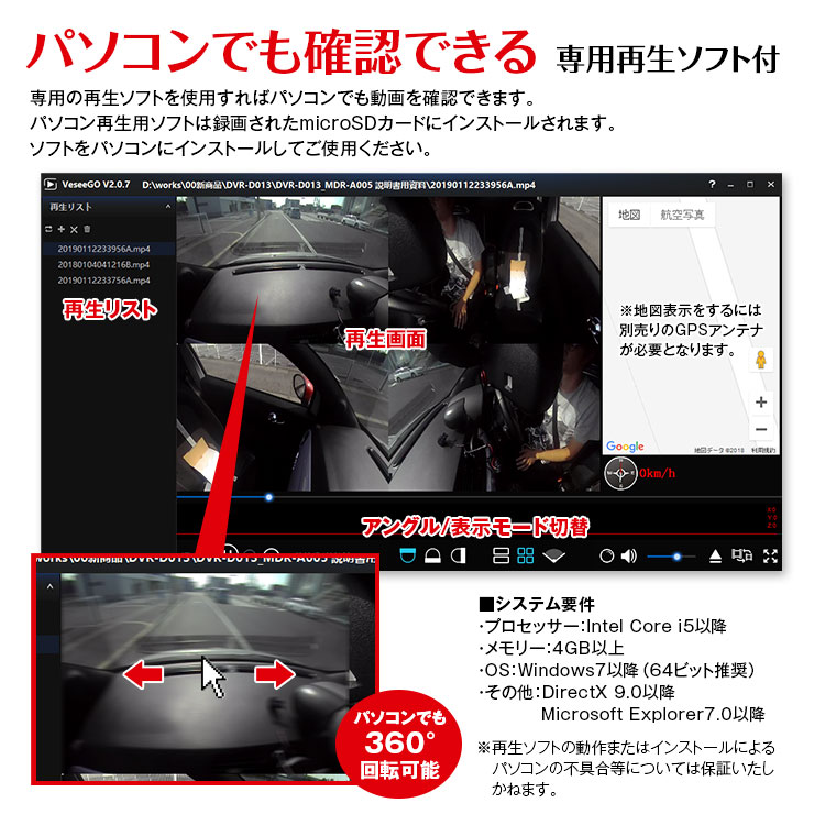 専用の再生ソフトを使用すると録画した映像をパソコン上で様々なアングルの映像を確認できます。