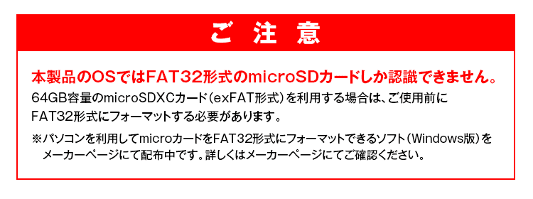 ※本製品のOSではFAT32形式のmicroSDカードしか認識できません。64GB容量のmicroSDXCカード(exFAT形式)を利用する場合は、ご使用前にFAT32形式にフォーマットする必要があります。
